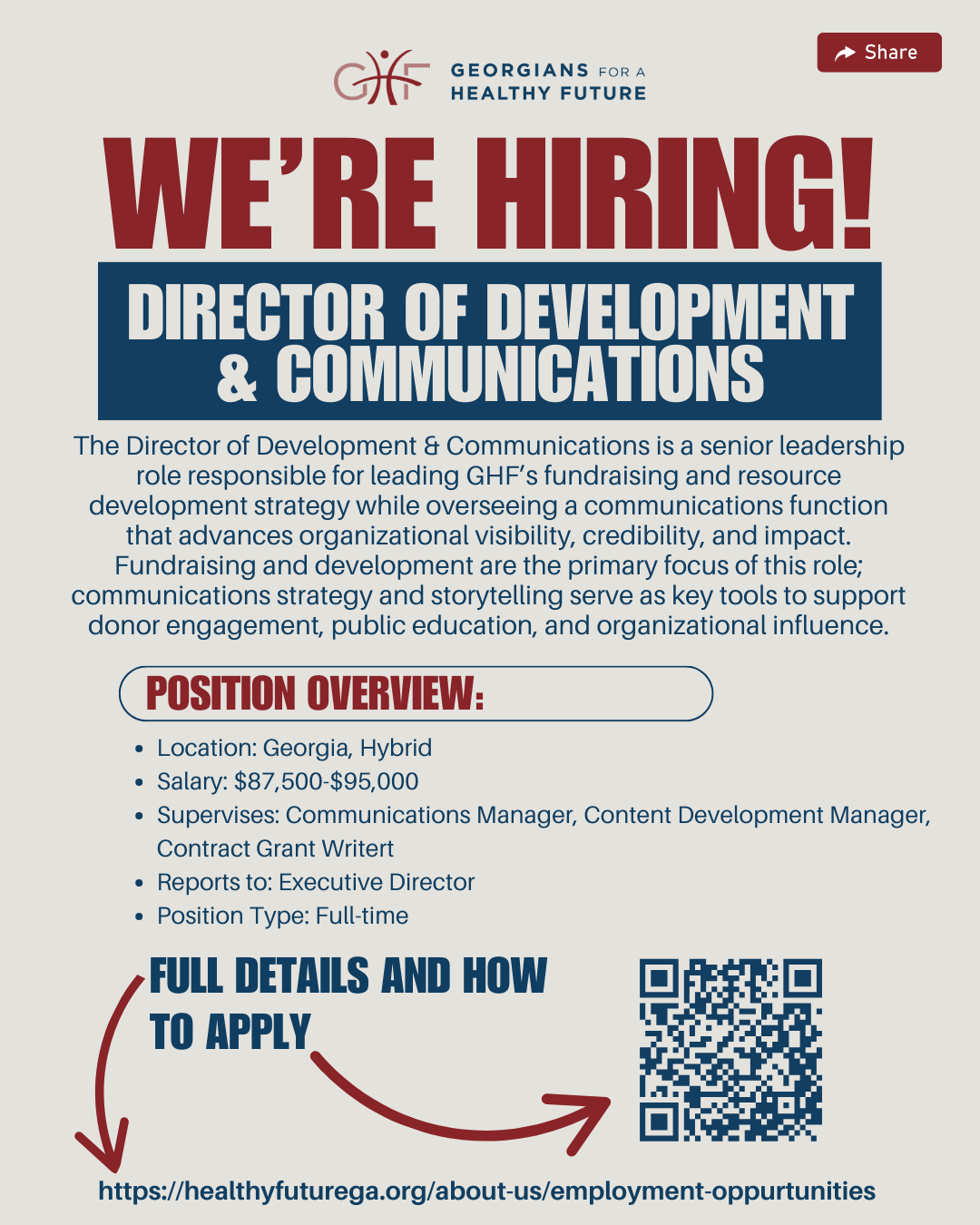 Georgians for a Healthy Future is growing our leadership team, and we’re looking for experienced, mission-driven professionals to join us! 💙 ✅ Director of Development & Communications – Lead fundraising strategy, donor engagement, and communications that advance health equity in Georgia. ✅ Directo...Read more