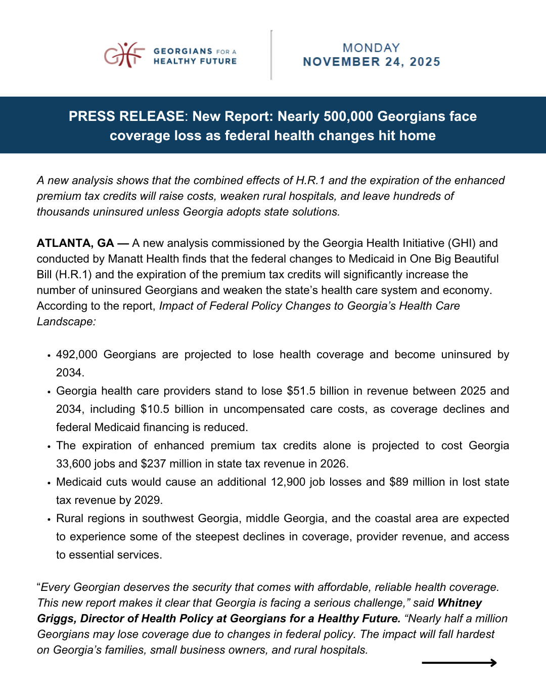 New Report: Nearly 500,000 Georgians Could Lose Coverage A new analysis shows that recent federal health policy changes could leave almost half a million Georgians uninsured, strain rural hospitals, and raise costs for families and providers across the state. But Georgia has options — and now is t...Read more