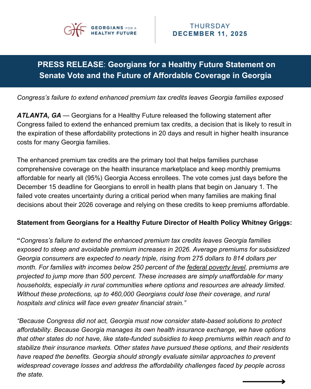 BREAKING: Congress’s failure to extend enhanced premium tax credits leaves Georgia families exposed. Today (Dec. 11, 2025), Georgians for a Healthy Future released a statement on Congress's failure to extend crucial enhanced premium tax credits. This inaction, just 20 days before protections expire...Read more